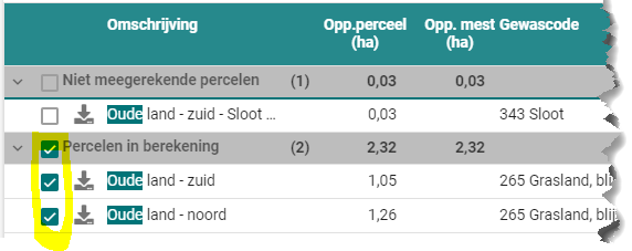 MERK OP (2): het aantal genegeerde percelen treft je aan in de kolom ‘Negeer’. Hiermee kun je controleren of het terecht is dat er een aantal percelen niet meegerekend worden.
