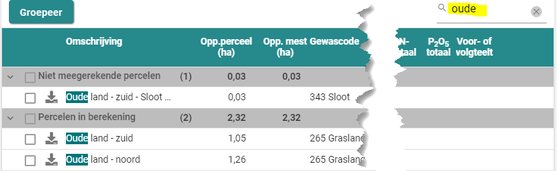 Stel: je zoekt alle percelen in ‘Oude land’ met de zoekterm ‘Oude’