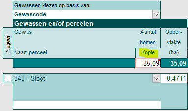 Vastleggen originele oppervlakte Om te controleren of bij de opgetelde, gesplitste percelen evenveel oppervlakte is ingevoerd, kan de originele oppervlakte, voor de splitsing, gekopieerd worden naar een controle-veld. Onderstaand is eerst een kopie van de oppervlakte gemaakt